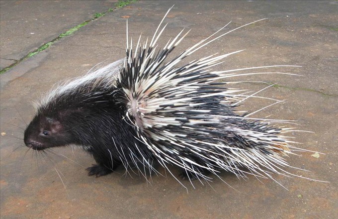 習(xí)性:豪豬棲息于低山森林茂密處。穴居,常以天然石洞居住,也自行打洞。夜行性?;顒?dòng)路線較固定。以植物根、莖為食,尤喜盜食山區(qū)的玉米、薯類、花生、瓜果蔬菜等。受驚時(shí),尾部的刺立即豎起,刷刷作響以警告敵人。