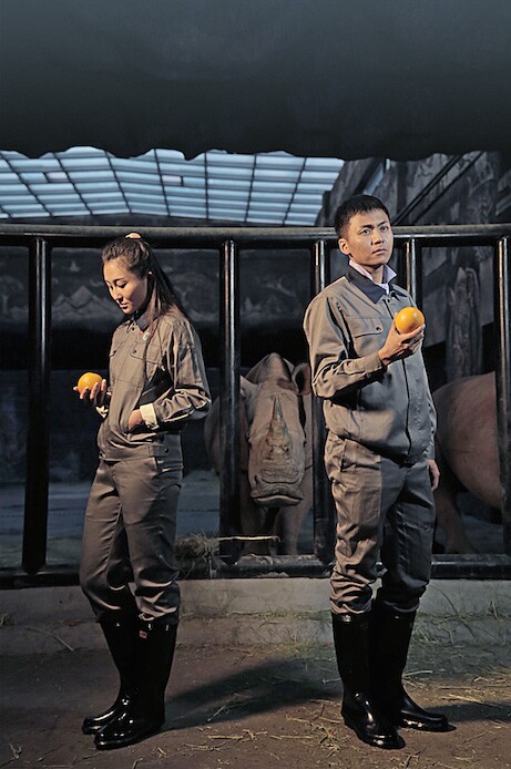 (海報攝制時,兩頭白犀牛十分“給面子”。圖中:牢籠、犀牛、橙子、距離、都是本片的關鍵詞。)