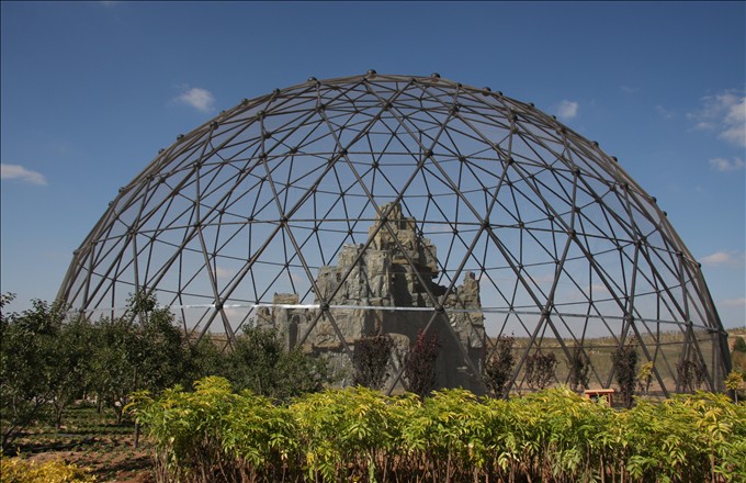 猛禽苑:主體為半球冠形單層鋼網(wǎng)殼造型的猛禽苑高30米,跨度60米,底部直徑60米,子單元均為三角形,由15個支座均分地面圓周360度。圍護(hù)面積677.06平方米,室外觀賞平臺面積為39.2平方米,平臺下部室內(nèi)建筑面積637.86平方米。